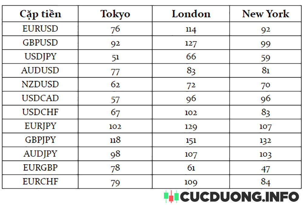 Hãy xem biến động bình quân của các cặp tiền trong từng phiên giao dịch