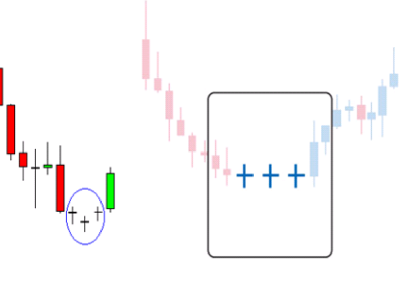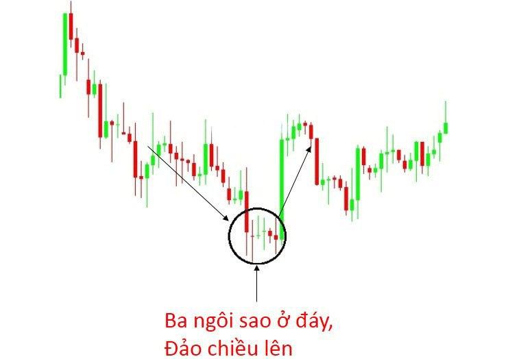 Việc nhận dạng nến này khá dễ, có thể thấy mô hình nến này là ba ngôi sao được gọi là mô hình ba nến Doji. Ba nến này xuất hiện 1 cụm liên tiếp nhau như ba ngôi sao.